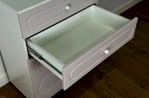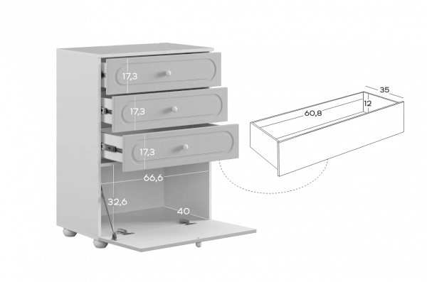 Комод оснащён тремя выкатными ящиками на шариковых направляющих, обеспечивающими плавный и надёжный ход. Ящики подойдут для хранения одежды, белья, аксессуаров или игрушек. В нижней части расположена вместительная откидная секция, предназначенная для более габаритных предметов и сезонных вещей.